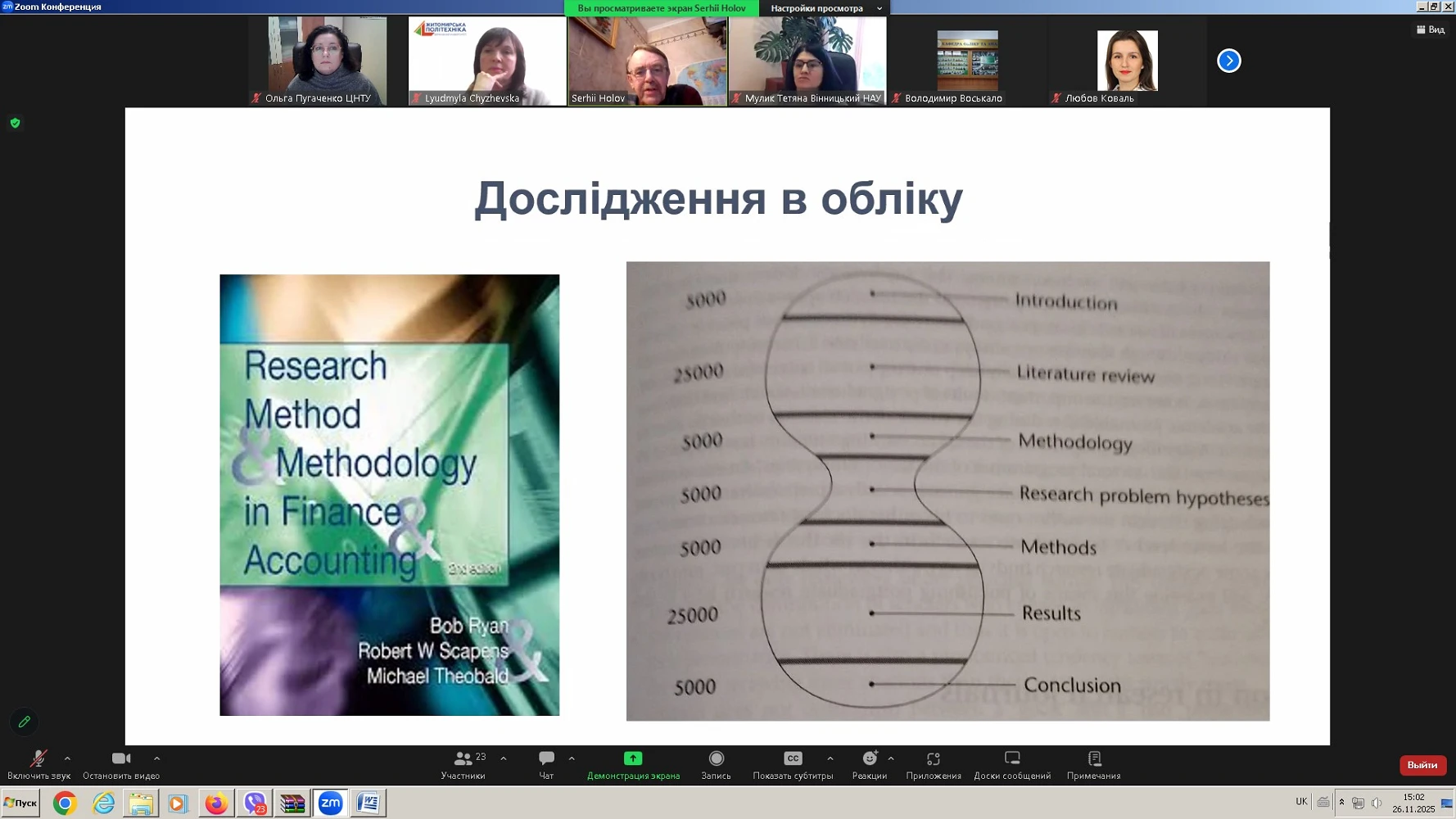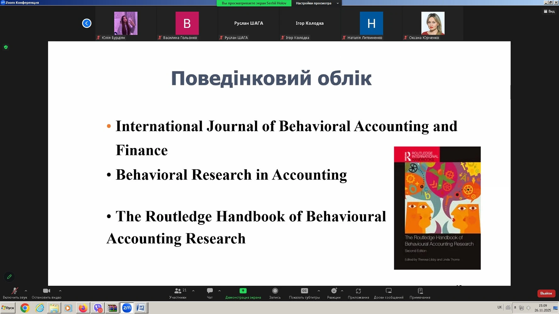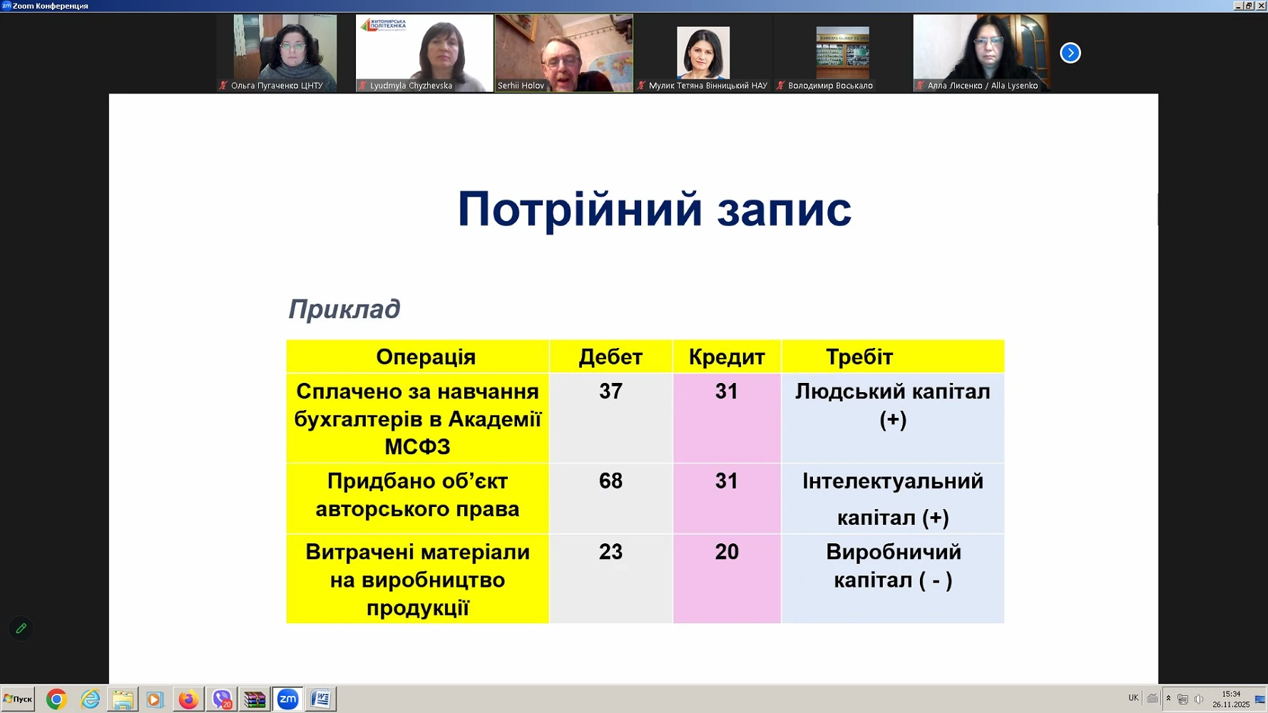 26 листопада 2025 року доценти кафедри аудиту, обліку та оподаткування Ольга ПУГАЧЕНКО, Алла ЛИСЕНКО та Оксана ЮРЧЕНКО долучилися до гостьової лекції «Теорії і методи бухгалтерського обліку: сучасний погляд» для здобувачів та науково-педагогічних працівників університетів, де здійснюється підготовка фахівців з обліку та оподаткування.
