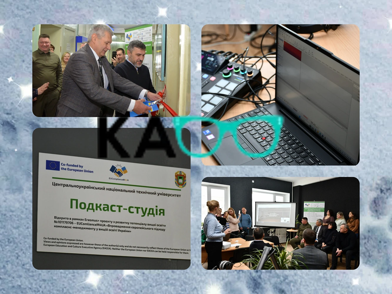В межах цього проєкту EUComplianceM4UA на базі нашої кафедри було відкрито сучасну подкаст-студію, створену та обладнану на грантові кошти при співфінансуванні ЦНТУ. Обладнання студії – ноутбук, планшет, мікшерний пульт, акустична система, мікрофони, навушники, ліцензований аудіоредактор Hindenburg тощо – придбане в межах гранту сумою більше 7000 євро, профінансованого за програмою Європейського Союзу ERASMUS+.
